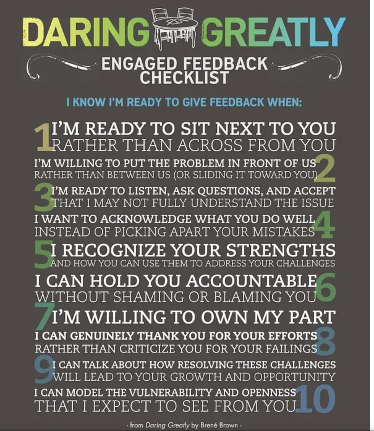 有很多朋友问,情侣之间也好,夫妻之间也好,该怎么吵架才不会伤感情。刚刚结束的女性团体小组里,她们也问过相似的问题,在亲密关系中,该如何平和的沟通而不产生如此巨大的冲突,甚至情绪崩溃。小组活动的时候,就让我的组员们练习如何沟通,一方去听,一方去表达。双方都发现,用我教他们的坚定而温柔的方法表达,听者很难发火刁难表达方,而表达方也不会恣意发泄自己的情绪而无法真正表达自己的需求。是不是感觉,即使是最亲密的彼此,都很少,全情投入沟通,常常是相互指责,希冀对方改变?那么今天,我们不如回归到自己,看看以下哪些我们可以从今天开始做起,全情投入地表达及反馈给我们重要的对方。去年回国的时候,顺手就将Brene Brown的脆弱的力量带上飞机读。Brene在她的几本书里都大胆地提到了,展现我们的脆弱的一面,在安全的环境下反而是能够增加我们的心理弹性,也即我们的心理健康恢复能力。以下,就摘取,她在书中提及的,亲密关系也好,朋友也好,工作关系也好,我们在关系中,如何进行反馈,可以进行表达的方式,在她眼里,这十条叫做全然投入的反馈方式。